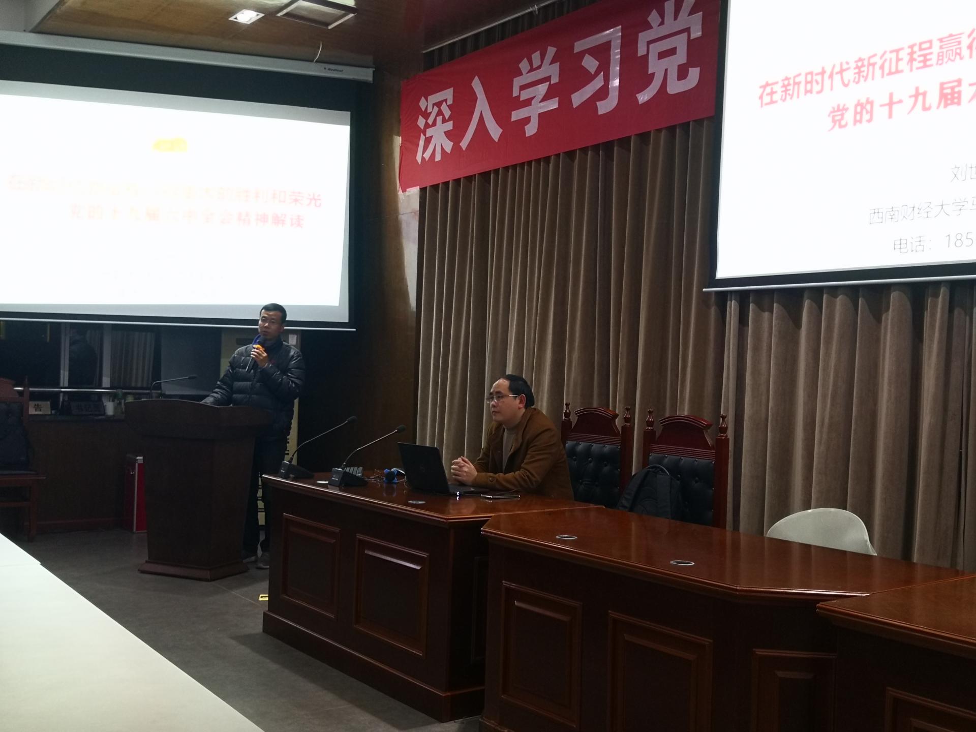 为深入学习党的十九届六中全会精神,引导广大青年用理论知识武装自己,增强自身修养,西南财经大学法学院与12月14日晚上在模拟法庭I304开展了党的十九届六中全会精神宣讲会。此次宣讲会邀请了四川省十九届六中全会宣讲团成员、马克思主义学院刘世强教授做“在新时代新征程赢得更大的胜利和荣光
