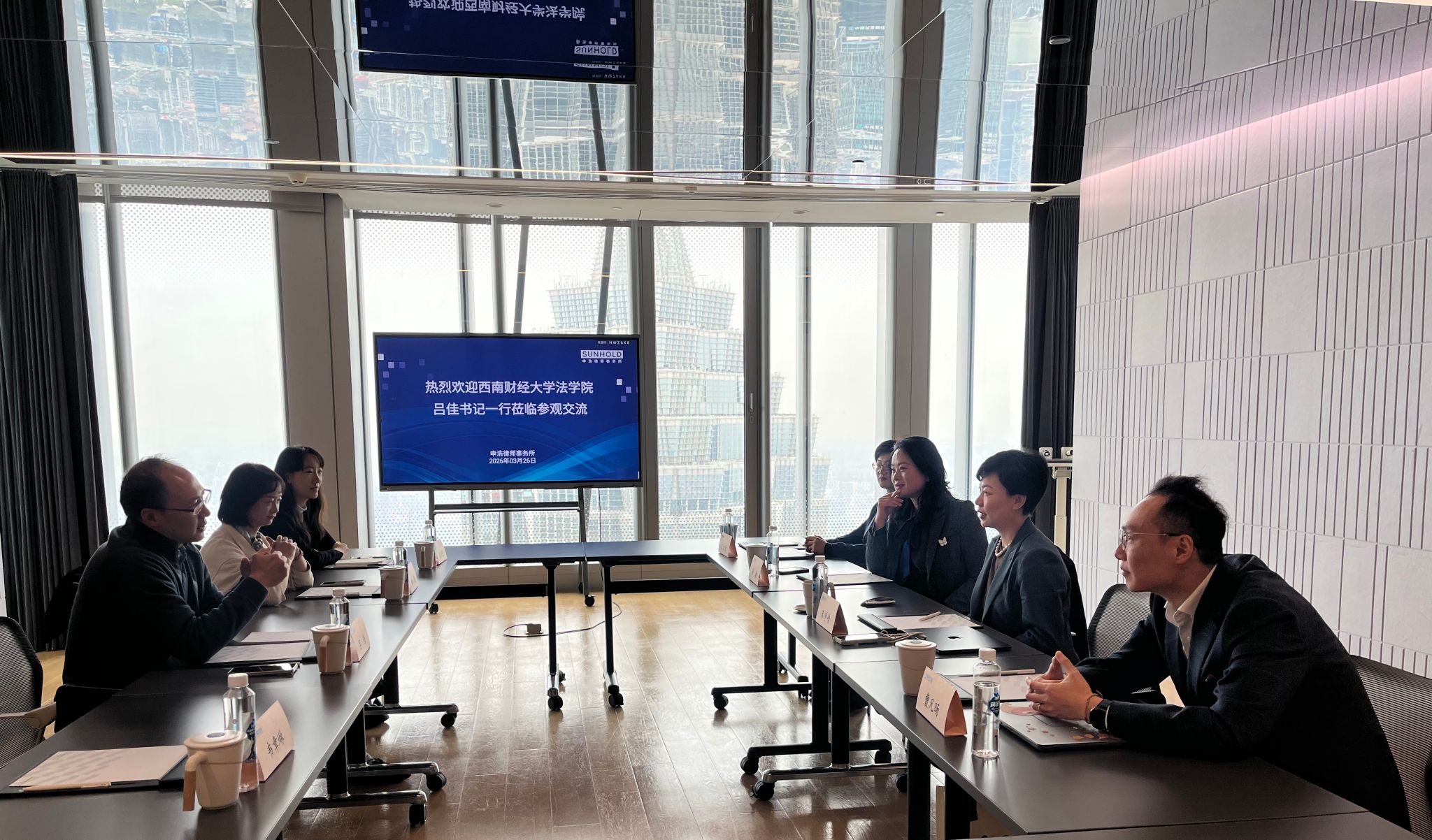为深化产教融合,强化“四环联动”,促进高质量充分就业,3月26日,法学院党委书记吕佳、党委副书记杨扬、辅导员韦章琳及学生代表一行赴上海申浩律师事务所开展访企拓岗工作,走访校友并商讨合作。事务所高级合伙人、副主任、申浩北京主任朱申岭,合伙人孙瑜,合伙人曹凡旸等热情接待。