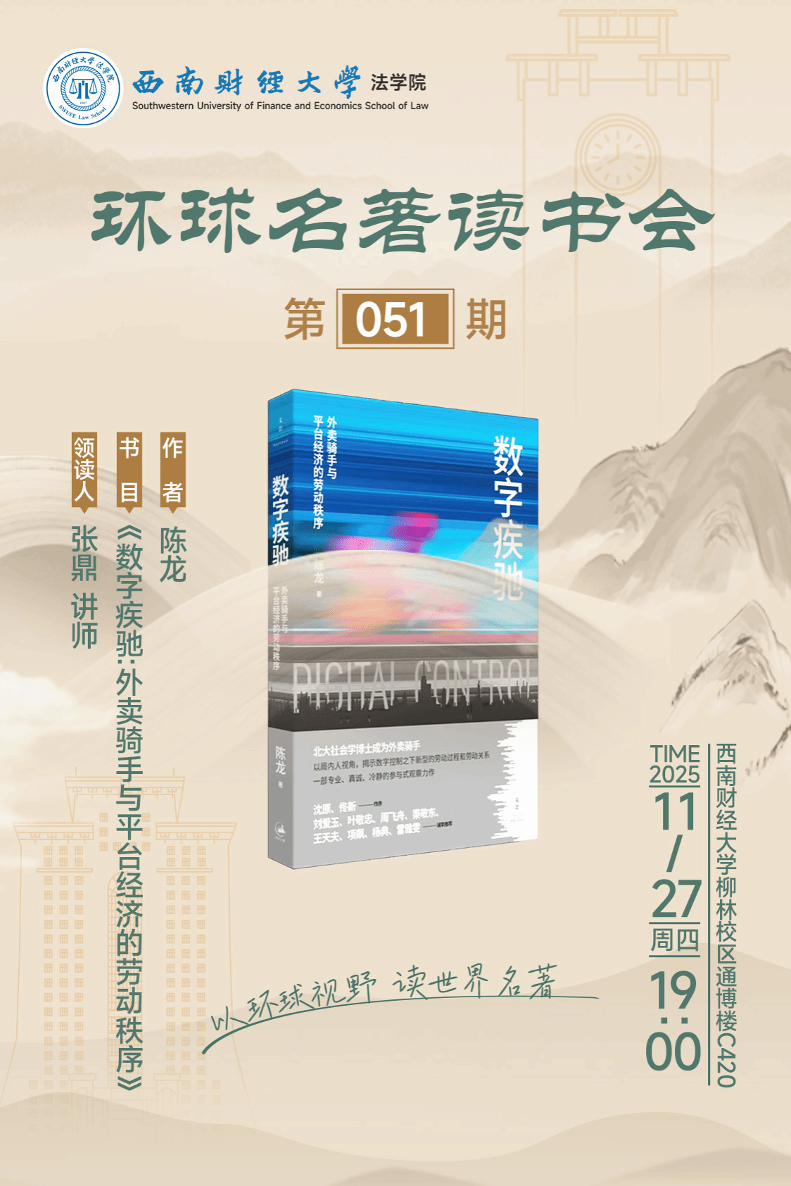 注:「环球」名著读书会是西南财经大学法学院提升学生综合素质的规划之一,旨在培育学生的人文素养,营造读书氛围,启发学生对生活的感知能力、思考与反思能力。读书会所选书目均为法学专业之外的人文社科著作,领读形式各异,每期活动会向积极参与的学生赠书,以作留念。