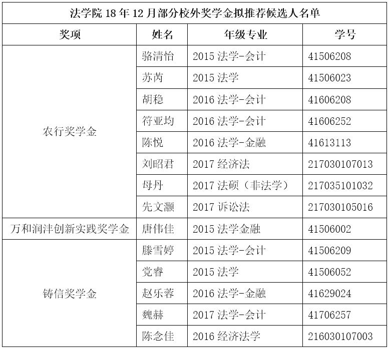 根据学校工作安排,经学生个人自主申报、学院评审会审核评选,现已完成我院18年12月部分校外奖学金候选人的拟推荐工作。现将此次学院拟推荐人员情况予以公示,名单如下: