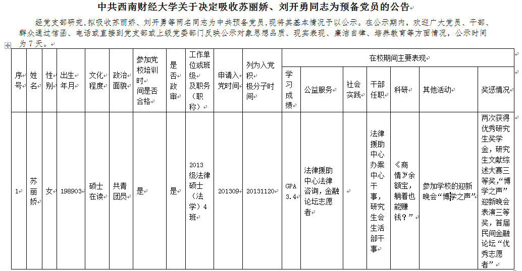 下一条:中共西南财经大学关于拟吸收 周凡力 等 2名同志为中共预备党员的公告