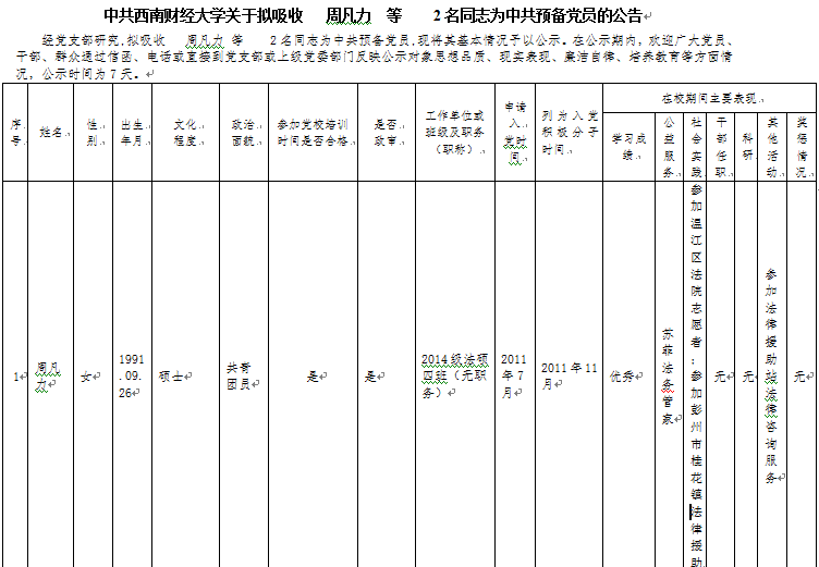 中共西南财经大学关于拟吸收 周凡力 等 2名同志为中共预备党员的公告