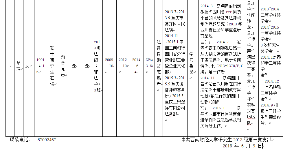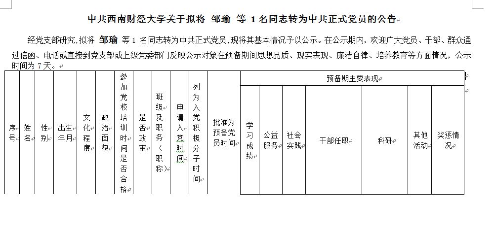 中共西南财经大学关于拟将 邹瑜 等 1名同志转为中共正式党员的公告