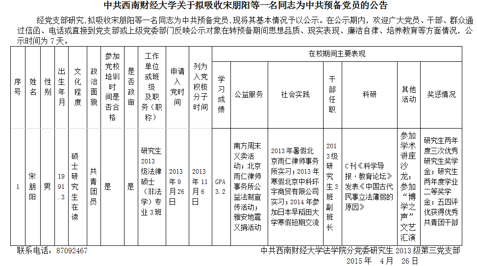 下一条:中共西南财经大学关于拟将马天琳等3名同志转为中共正式党员的公告
