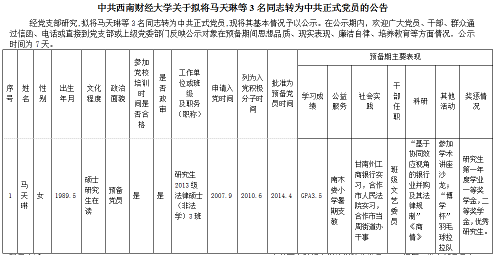 中共西南财经大学关于拟将马天琳等3名同志转为中共正式党员的公告