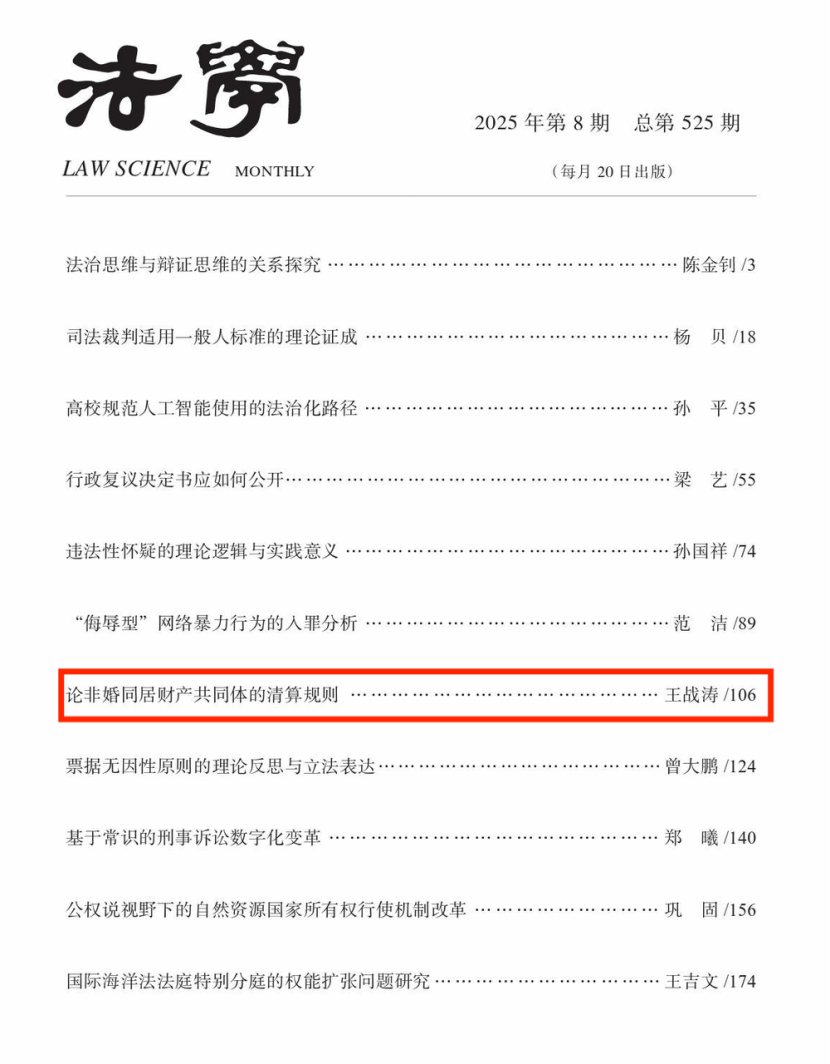 我院王战涛老师在《法学》2025年第8期上发表高质量学术论文《论非婚同居财产共同体的清算规则》。《法学》是由华东政法大学主办的中文法律类期刊,居南京大学“中文社会科学引文索引”(CSSCI)和北京大学“中文核心期刊要目总览”之列,被中国社会科学评价研究院遴选为“中国人文社会科学期刊AMI综合评价”A刊核心期刊,入选“世界学术影响力Q1期刊”。