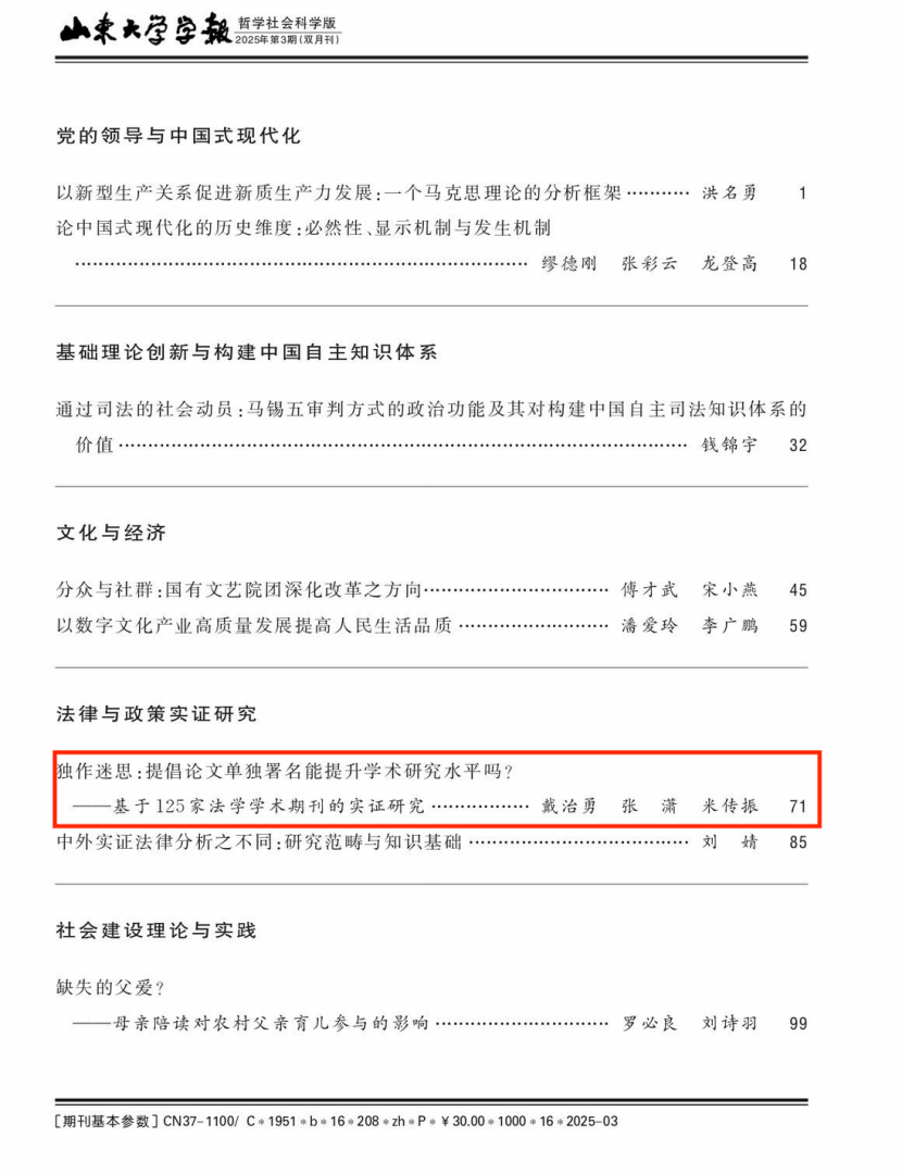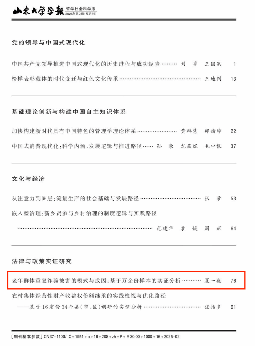 我院戴治勇教授、夏一巍副教授的两篇法学实证论文于《山东大学学报(哲学社会科学版)》发表。两篇论文分别为2025年第3期的“独作迷思:提倡论文单独署名能提升学术研究水平吗?——基于125家法学学术期刊的实证研究”与2025年第2期的“老年群体重复诈骗被害的模式与成因:基于万余份样本的实证分析”。《山东大学学报(哲学社会科学版)》是新中国成立后创办的第一份大学学报,是由国家教育部主管、山东大学主办的综合性学术理论刊物。主要刊发经济、管理、政法和人文等哲学社会科学领域的创新性研究成果。
