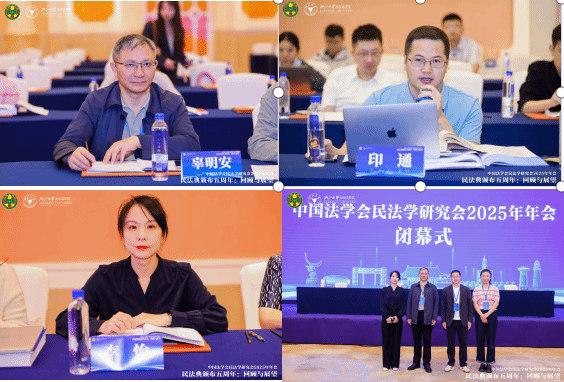 2025年10月17日至19日,中国法学会民法学研究会2025年年会在浙江省杭州市顺利召开。本届年会由中国法学会民法学研究会主办、浙江大学光华法学院承办,主题为“民法典颁布五周年:回顾与展望”,除主会场外另设七个平行论坛,共涵盖21个单元。与会专家学者围绕全面贯彻实施《民法典》的基本问题、民法基础理论和《民法典》各编的实施问题、数字法学与《民法典》的实施问题等展开了深入探讨。我院辜明安教授、印通副教授、李怡老师及民商法学博士研究生宋世伟、吴仲云应邀参加本届年会。