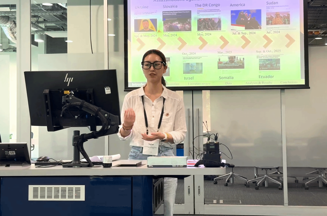 舒悦涵同学受邀参加平行论坛“国家与政治安全犯罪”(State and Political Crime)专题并作论文汇报(论文作者:熊谋林、舒悦涵、贾悦平、郑澳琪),汇报内容是国家安全相关议题。文章通过收集全球数据,运用实证研究方法向各国学者展示了当前的全球安全趋势。汇报现场,一名菲律宾学者对此议题展示出较大的兴趣,与舒悦涵同学展开了学术讨论。
