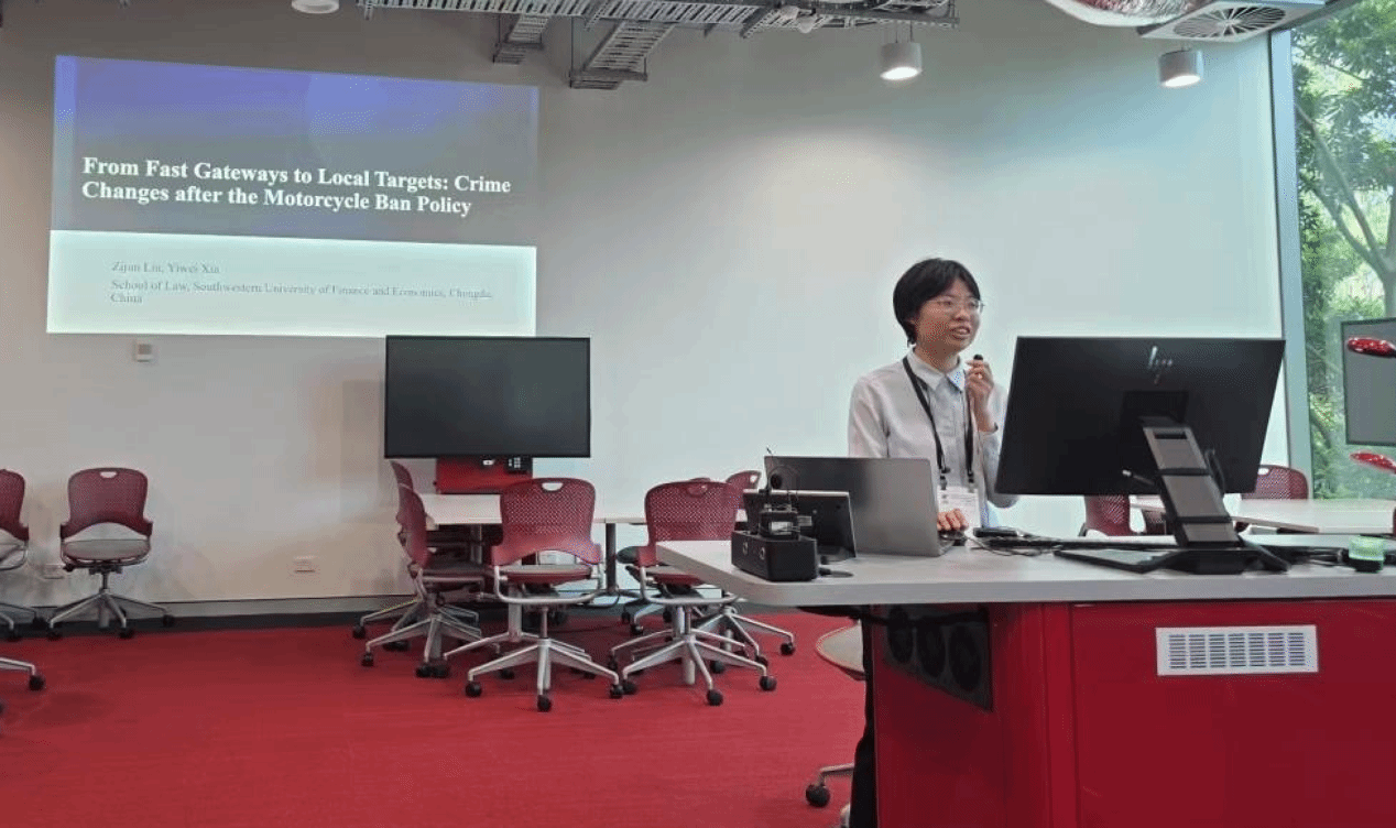刘姿君同学受邀参加平行论坛“治安与犯罪预防”(Policing and Crime Prevention)专题并作论文汇报,汇报题目为《从快速通道到当地目标:禁摩政策后的犯罪模式变化》(From Fast Gateways to Local Targets: Crime Changes after the Motorcycle Ban Policy)。她使用渐进双重差分模型探索禁摩政策对犯罪模式变化的影响,并汇报了该政策实施后,犯罪类型、犯罪地点及犯罪时间维度下的犯罪模式转移结果。