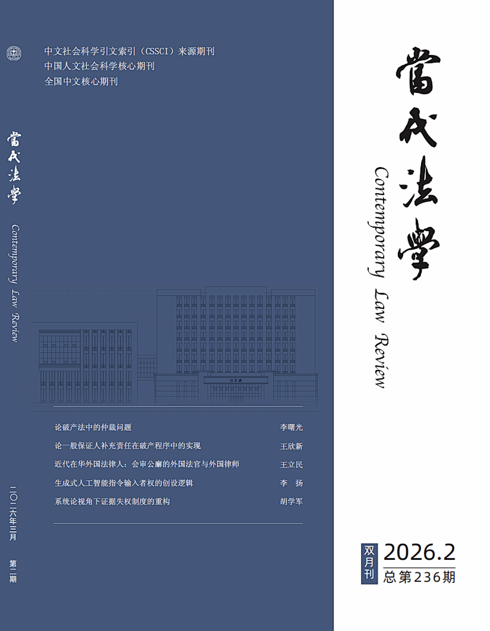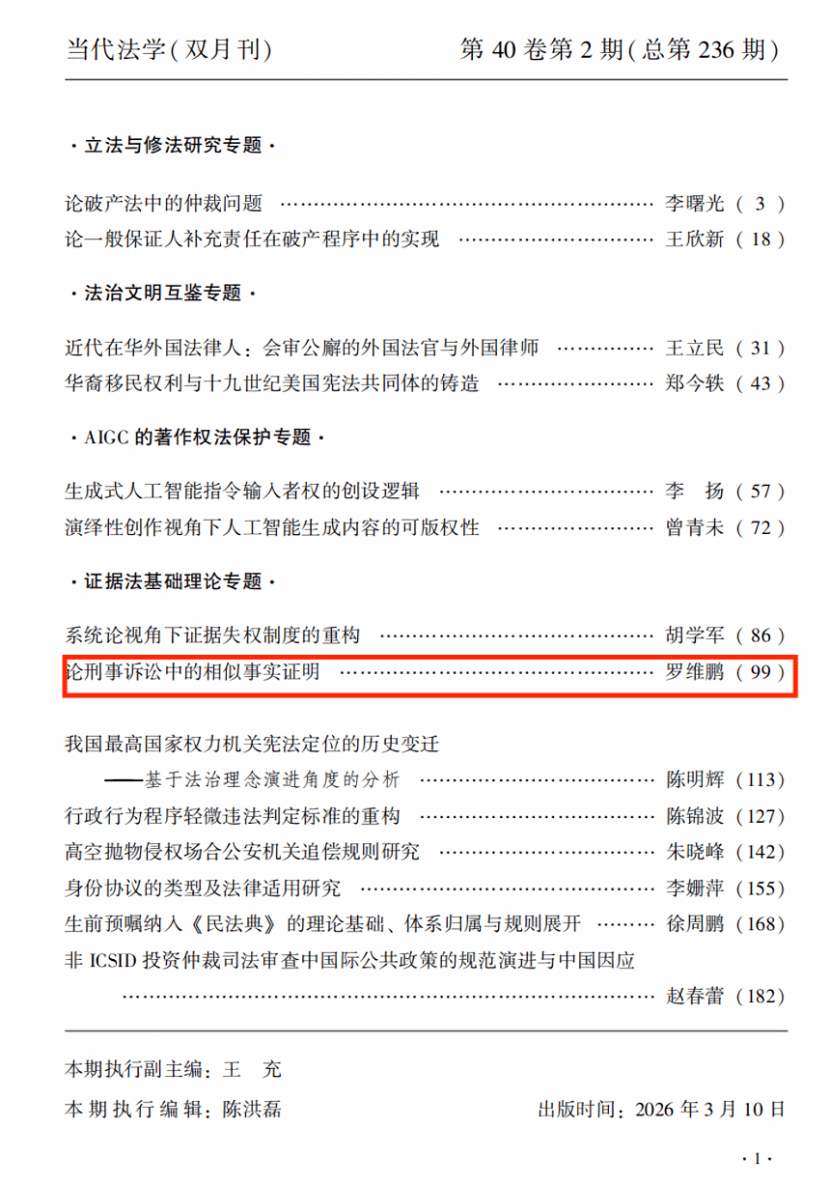 我院罗维鹏副教授在《当代法学》2026年第2期上发表高质量学术论文《论刑事诉讼中的相似事实证明》。《当代法学》自2008年开始入选中文社会科学引文索引(CSSCI)来源期刊;自2019年开始,入选中国法学核心科研评价来源期刊目录(CLSCI)。同时入选中国人文社会科学核心期刊(AMI)、中文核心期刊要目总览(北大核心)、中国核心学术期刊(RCCSE)。《当代法学》也是《新华文摘》《中国社会科学文摘》《高等学校文科学术文摘》《人大复印报刊资料》等权威文摘的来源期刊。