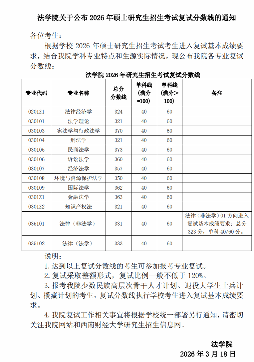 法学院关于公布2026年硕士研究生招生考试复试分数线的通知